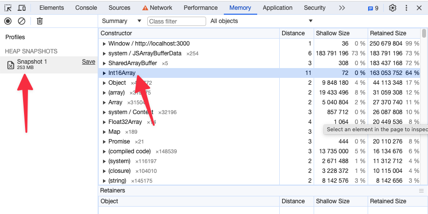 After (with flag, running locally) the app shows 249 MB of memory usage