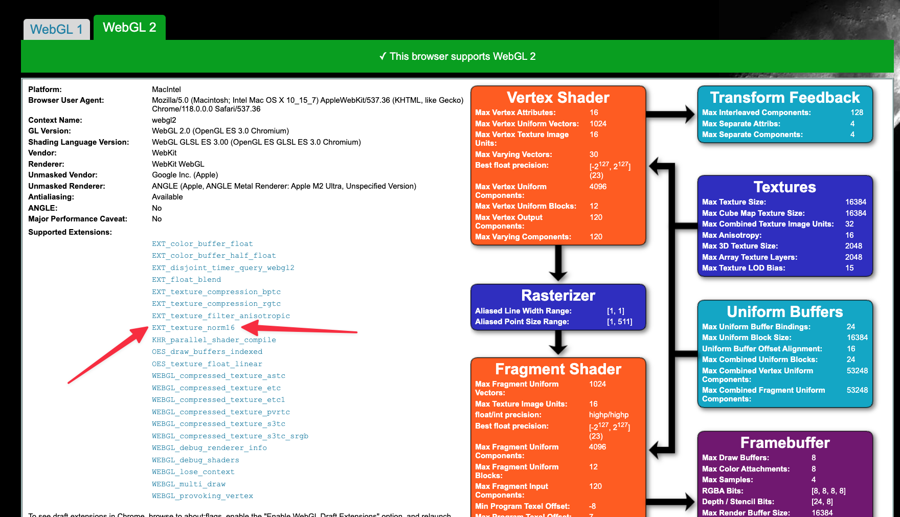 Through EXT_texture_norm16 , WebGL can support 16 bit data type which is ideal for most images. You can look into the webgl report to check if you have that extension enabled.
